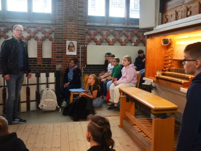 Rund anderthalb Stunden hören die Schülerinnen und Schüler zu, reichen Orgelpfeifen herum und dürfen selbst an den Spieltisch – und Arne Hallmann freut sich über die Aufmerksamkeit, mit der sie seinen Erklärungen folgen. Anschließend übernimmt wieder Isabel Wagemann-Steidel und zeigt ihren Schülerinnen und Schüler noch Altar, Taufstein und Kanzel. Ihr ist es ein Anliegen, in ihrer multireligiösen Klasse Wissen über die eigene und die Religionen der Mitschülerinnen und -schüler zu vermitteln – die Orgelführung gab dafür einen guten Rahmen ab.