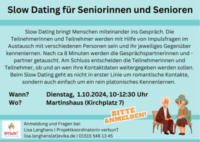 VerbunT Gemeinwesenarbeit: Slow Dating für Seniorinnen und Senioren am 1.10.2024
