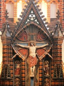 Der neugotische Altar gehört zur Art des Kreuzaltars, hier in der seltenen Form des Backsteinaltars, der hinter der Kreuzdarstellung eine geschlossene Altarwand aufweist.