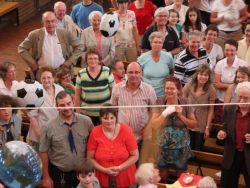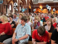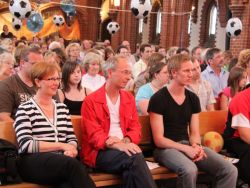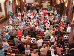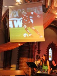 Danach ging es weiter mit dem runden Leder, viel Spaß hatten die Gottesdienstbesucher, als sie durch das gesamte Kirchenschiff „Ball über die Schnur“ spielen durften, wobei die Besucher in den hinteren Bänke siegten. Fetzige Lieder, wie „96 alte Liebe“ und „Spinner“ von der Band Lichtblick umrahmten den Fußball Gottesdienst, sowie das zum Abschluss gesungene brandaktuelle Lied „Satellite“. Danach genoss man bei Chips, Cola und Bier den gemeinsamen Austausch und versorgte sich schon mal mit Blick auf die beginnende Fußball WM mit den Farben der Deutschlandflagge auf den Wangen.