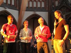 Danach folgte das interessante Interview mit dem Profifußballer Jan Rosenthal von Hannover 96. Das Moderatorenduo Rita Kischlat und Hartmut von Blanckenburg hatten diesmal den 96 Fan Steffen Grott als Unterstützung an ihrer Seite, der Fragen aus seiner jugendlichen Sicht an den sympathischen Profifußballer stellen durfte. Jan Rosenthal teilte den zahlreich erschienenen Besuchern mit, dass es im Profifußball um mehr geht, als gut Fußball zu spielen. Gefragt sind mentale Stärke, gutes Selbstmanagement und wichtig sei, dass man in Krisensituationen auf eigene Ressourcen zurück greifen kann. Offen und authentisch kamen seine Antworten rüber und die Zuhörer dankten mit reichlich Applaus.