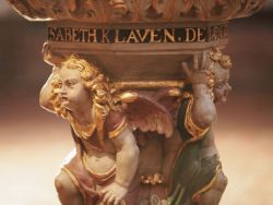 Zwei einander gegenüber liegende Seitenflächen des sechseckigen Taufsteins zeigen die Wappen der beiden Stifter mit ihren Initialen. Ein unter dem Becken um den Sockel des Taufsteines herumgeführtes Schriftband nennt ihre Namen: