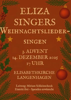 Am 14. Dezember, dem 3. Advent, findet um 17:00 Uhr in der Elisabethkirche Langenhagen wieder das traditionelle Advents- und Weihnachtsliedersingen mit den Eliza-Singers statt.