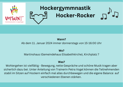 Hier werden Gelenke geschmiert, das Gehirn aktiviert, die Lunge gepflegt und alles bewegt. Bei uns gehts im Sitzen, auch ohne Schwitzen. Für die Ohren läuft die Musika und sicher sind nette Menschen da. So trainiert sich auch die Stimme, für ein Schwätzchen hält man inne.