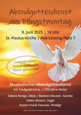 Am 9. Juni lädt die St.-Paulus-Gemeinde um 18.00 Uhr alle Kirchengemeinden in Langenhagen zu einem musikalischen Abendgottesdienst mit Taufgedächtnis „1700 Jahre Nicäa“ in die St.-Paulus-Kirche ein.