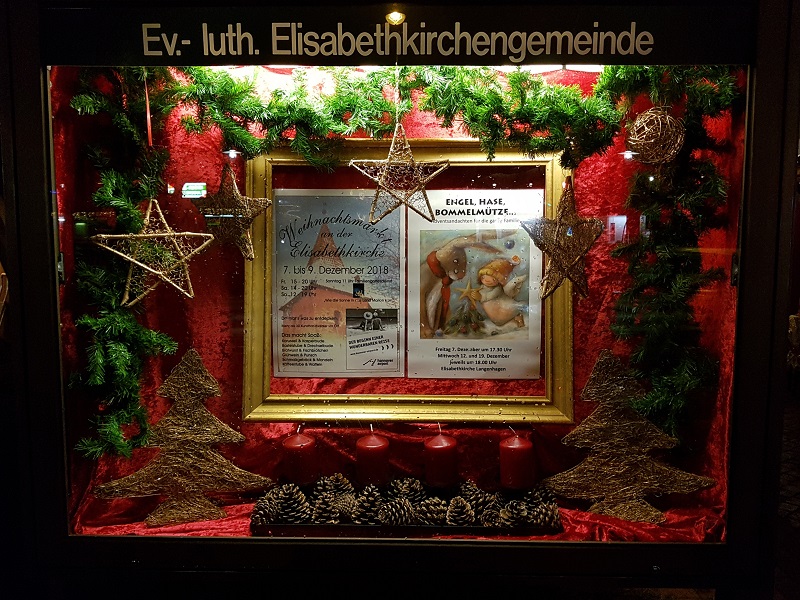 Von Freitag, 6. Dezember bis Sonntag, 8. Dezember findet wieder der beliebte Weihnachtsmarkt an der Elisabethkirche statt. Freitag 15 - 20 Uhr; Samstag 14 - 20 Uhr; Sonntag 12 - 19 Uhr