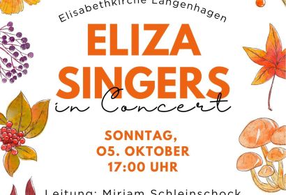 Die Eliza-Singers laden herzlich zu ihrem Konzert am Sonntag, 5. Oktober 2025 in die Elisabethkirche ein. Ab 17:00 Uhr erwartet Sie und euch ein abwechslungsreiches Programm unter der Leitung von Miriam Schleinschock.