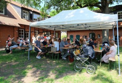 Familien genießen den Familienkirchentag bei sonnigem Wetter