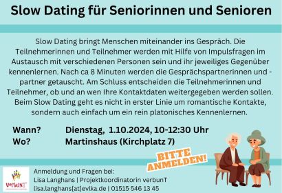 VerbunT Gemeinwesenarbeit: Slow Dating für Seniorinnen und Senioren am 1.10.2024